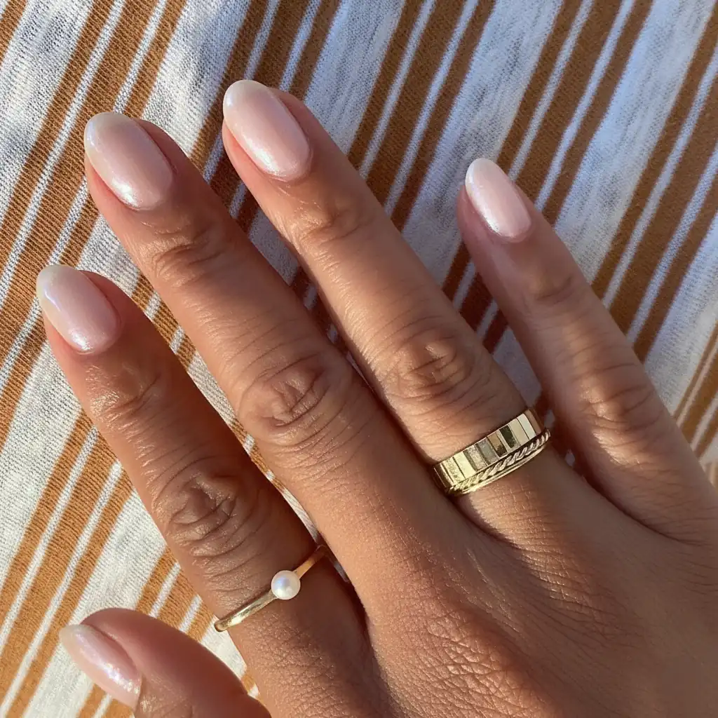 Pearl top coat on a squoval shape. The finish that makes a neutral look intentional.