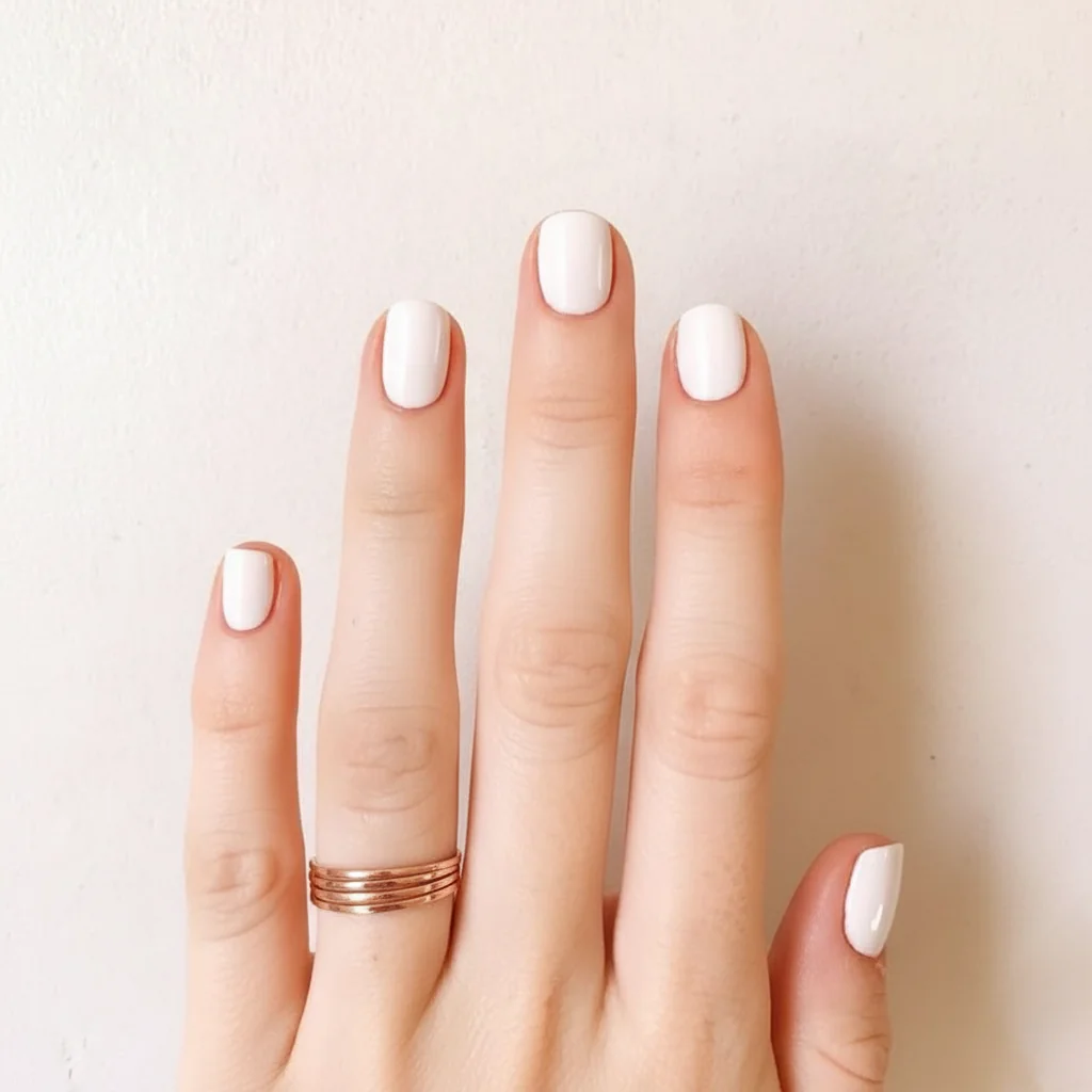 Short squoval with a milky base. Practical and polished, not a compromise.